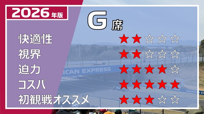 とはいっても性格の異なるG席なので、立体交差側は星3つ、130R側は星1つのイメージです。