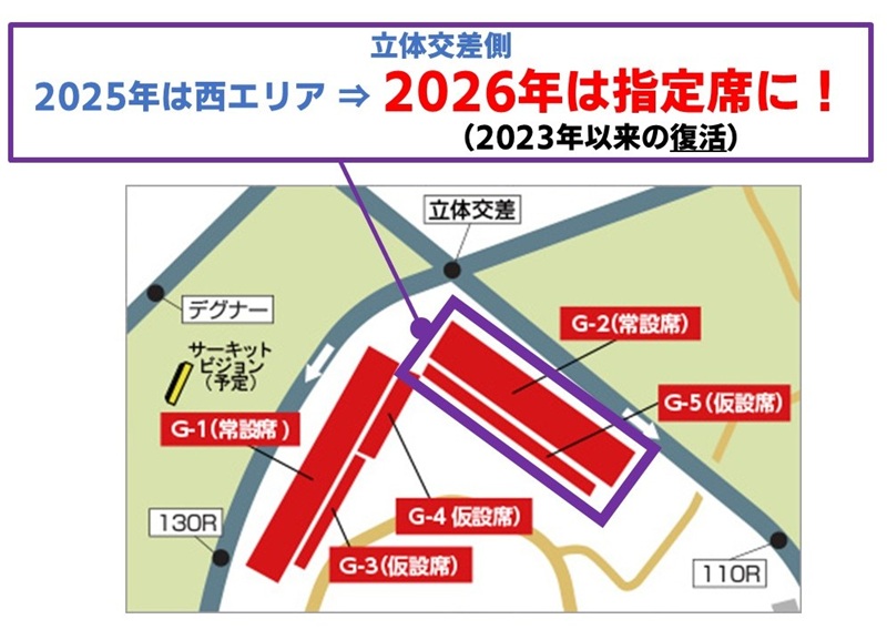 - 130R側:G-1 常設席/G-3 仮設席/G-4 仮設席