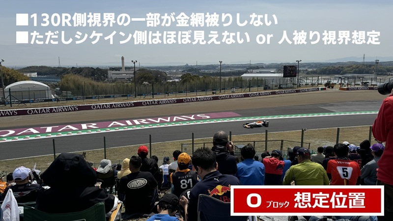 ただしOブロック側はほぼ130Rに位置するため、シケイン側はまったく見えない可能性があります。