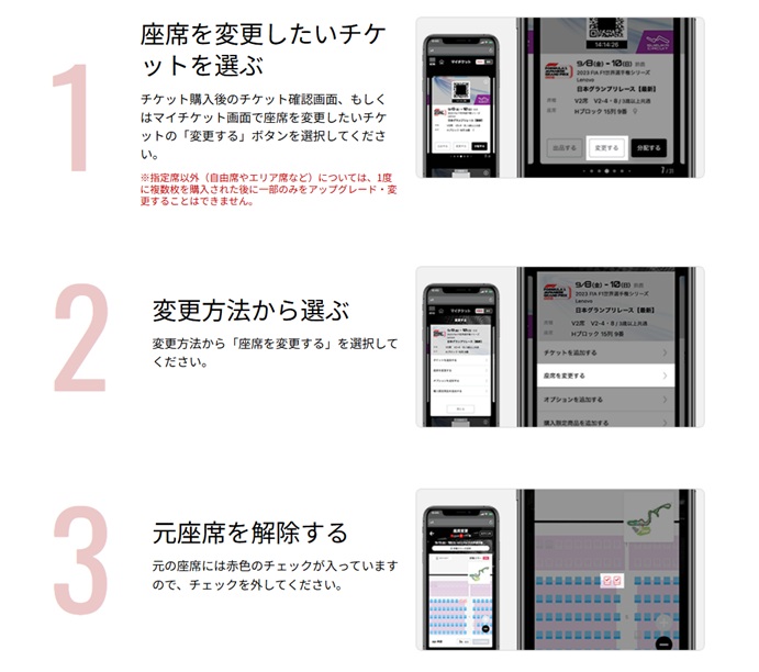- 電子チケットのみ変更可能、セブンイレブン発券チケットは変更不可。
