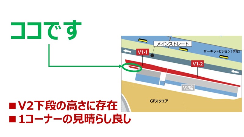 さらにV2席よりも1~2コーナー側に位置し、見渡せる視界も広いです。