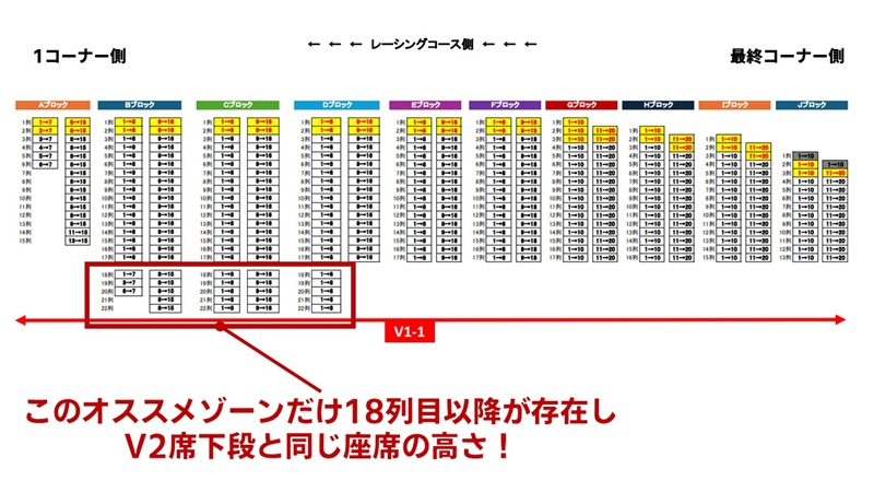 より1コーナー側に近い、V1-1席の方が高い料金に設定されています。