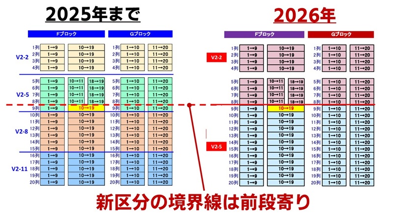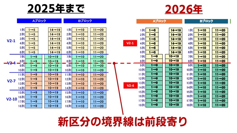 そのV2席、2025年までは合計12ブロック(横3×縦4)に細分化されていましたが。