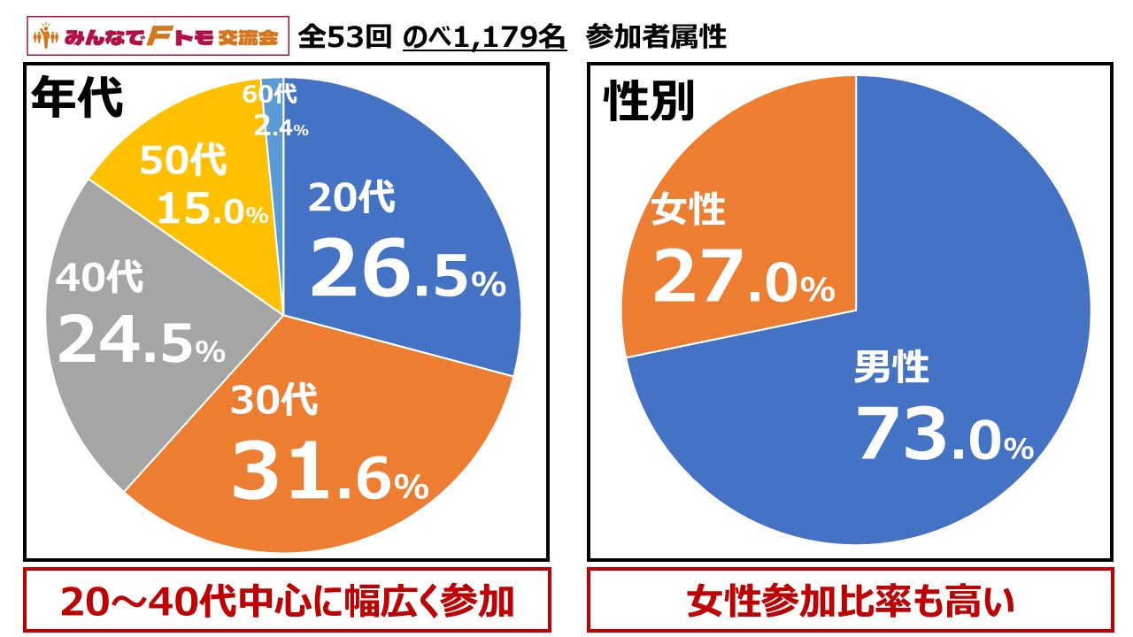 参加者は20~40代を中心に各世代から参加いただき、女性比率も30%弱と高いです。