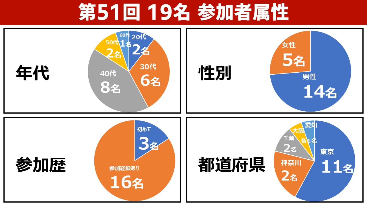 参加者の年代について、今回は30代・40代にやけに偏った回となりました。