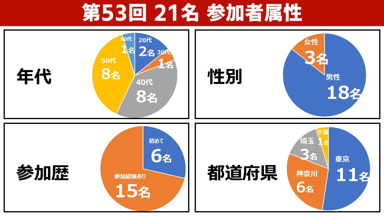 参加者の年代について、今回はなぜか40代・50代にかなり偏った回となり。