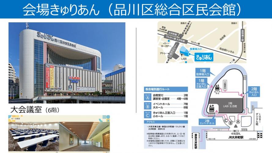 | 会場 | きゅりあん(品川区総合区民会館) 6階 大会議室 JR京浜東北線/東急大井町線/りんかい線「大井町駅」徒歩2分 東京都品川区東大井5丁目18-1 |